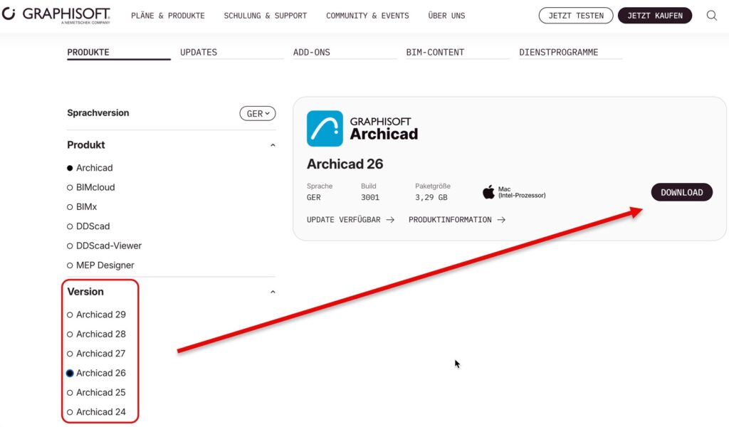 - Klicke neben der gewünschten Archicad Version auf „Download“.