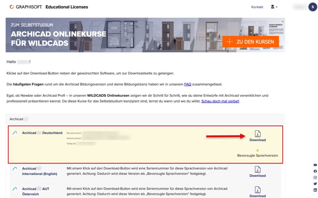 Logge dich zum Ändern deiner Sprachversion in dein Konto unter https://myarchicad.graphisoft.com ein und klicke im Bereich “Educational Licenses” auf den ”Download-Button” rechts neben der gewünschten Sprachversion.